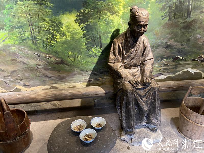 中國自古有施茶傳統(tǒng),鄉(xiāng)間有三里立茶亭、十里建長亭施茶,供路人休憩的風(fēng)俗。在茶之俗展廳,記者看到了一比一還原的施茶場景:施茶者坐于亭內(nèi),面前是3碗裝有端午茶的茶碗,等待過往路人前來飲用。施茶的習(xí)俗也體現(xiàn)了松陽人樂善好施的傳統(tǒng)美德。