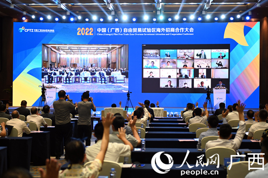 人民網南寧5月27日電 (記者彭遠賀)5月27日下午,2022中國(廣西)自由貿易試驗區(qū)海外招商合作大會在南寧舉行。大會以“自貿聯動世界,合作共繪藍圖”為主題,采用線上、線下結合方式,在北京和南寧同步設置主會場,在新加坡、馬來西亞、日本、韓國、德國、美國等國家或地區(qū)設置分會場,向全球展現廣西自貿試驗區(qū)經濟活力、創(chuàng)新動力和投資潛力,吸引全球優(yōu)質資源匯聚,共商共享合作機遇,共譜合作新篇章。