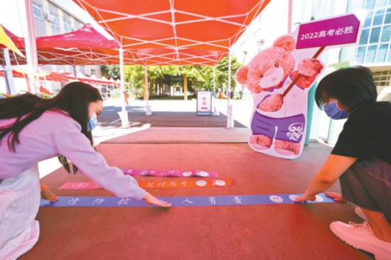 昨天上午,中國地質(zhì)大學(xué)附屬中學(xué)考點(diǎn)正在進(jìn)行考點(diǎn)布置工作。兩米線上除了疫情提示,還印有“沉著冷靜 笑對高考”“自信認(rèn)真 分分必得”等祝福語。本報(bào)記者 王海欣攝