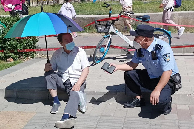 朝陽民警馬占富為摔倒老人提供幫助。朝陽公安分局供圖