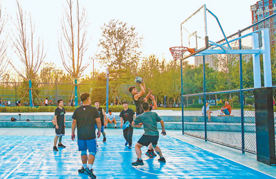 河北省石家莊市長安區(qū)拾光智慧體育公園里,市民正在打籃球。這座專業(yè)體育公園5月1日開放,以專業(yè)的運動設(shè)施和優(yōu)美的健身環(huán)境,吸引眾多市民前來鍛煉。近年來,各地大力新建改建體育場地設(shè)施,為全民健身全面開展夯實基礎(chǔ)。