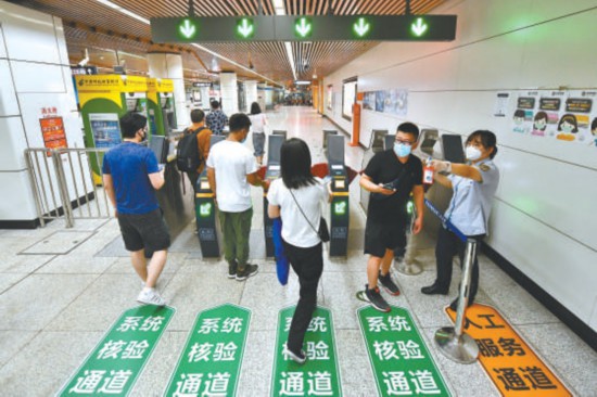 昨天,在地鐵十里河站,乘客從恢復開放的出入口進出站,工作人員在閘機位置幫助還沒升級一卡通的乘客進行升級。 本報記者 鄧偉攝