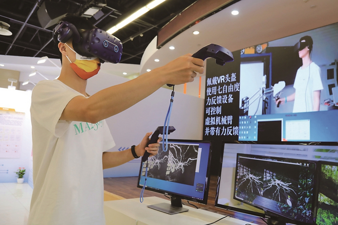 五月二十七日,東南大學舉辦“科學名世、人才報國”教學科研成果展,圖為現場展示的VR世界里操控虛擬機械臂。 本報記者 劉莉 攝