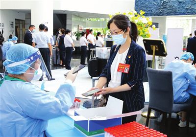 因新冠疫情防控需要,此次黨代會實行全程閉環(huán)管理?!罢埬葴y一下體溫?!惫ぷ魅藛T熱情地引導(dǎo)著。代表們佩戴口罩,保持間距,有序完成測溫、驗碼、安檢、流調(diào)、核酸檢測,隨后全身心投入到參會各項準備工作。