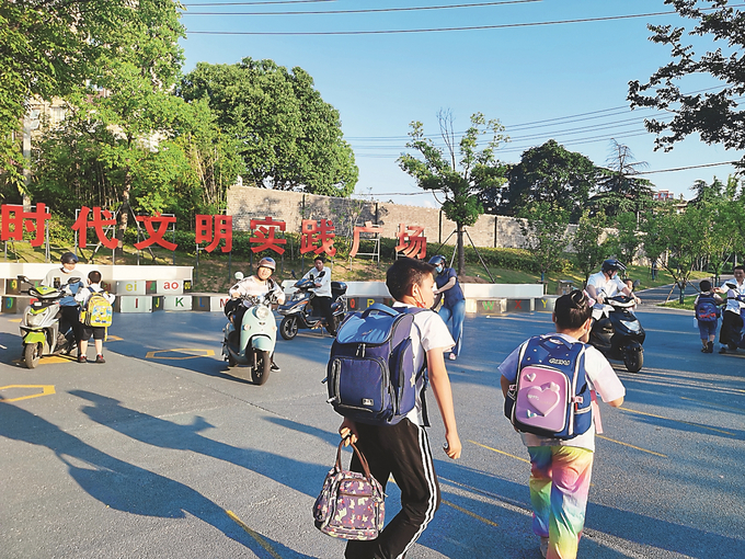 南京市棲霞區(qū)實驗小學(xué)西門前的口袋公園廣場上,孩子們歡笑著跑向父母。 劉玉琴 攝