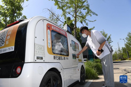 在雄安市民服務中心,市民在智能無人售賣車購買飲料(2022年5月27日攝)。新華社記者 朱旭東 攝