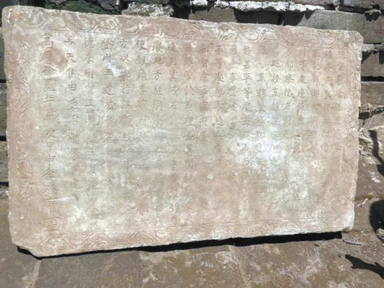 “發(fā)現(xiàn)一塊石碑,出土?xí)r碑文一面向下,推測這塊石碑原來鑲嵌在北側(cè)垛口墻內(nèi)側(cè),墻體傾斜倒塌后,石碑脫落?!表椖靠脊咆?fù)責(zé)人、北京考古研究院副研究員尚珩介紹。石碑為青石材質(zhì),保存完整,邊框刻著纏枝卷草紋。因為脫落時碑文面朝下,因此碑文保存完好,字體為繁體字,字跡娟秀,清晰可辨。