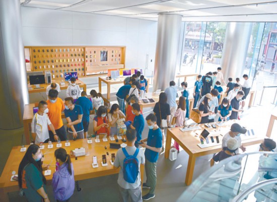 昨天,王府井APM購物中心蘋果產(chǎn)品零售店內(nèi),顧客在手機(jī)展示臺前駐足瀏覽,商場內(nèi)客流逐漸恢復(fù)。本報(bào)記者 和冠欣攝