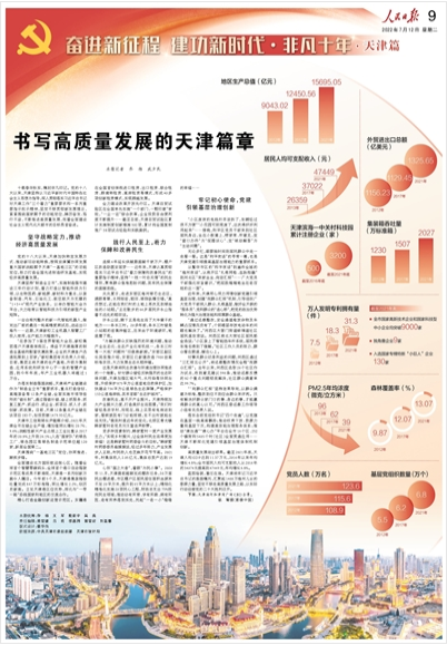 十載春華秋實(shí),鐫刻非凡印記。黨的十八大以來,天津堅(jiān)持以習(xí)近平新時(shí)代中國(guó)特色社會(huì)主義思想為指導(dǎo),深入貫徹落實(shí)習(xí)近平總書記對(duì)天津工作“三個(gè)著力”重要要求和一系列重要指示批示精神,堅(jiān)定不移貫徹新發(fā)展理念,緊緊圍繞國(guó)家賦予的功能定位,踔厲奮發(fā)、篤行不怠,不斷推進(jìn)高質(zhì)量發(fā)展,向著全面建設(shè)社會(huì)主義現(xiàn)代化大都市的目標(biāo)昂首奮進(jìn)。