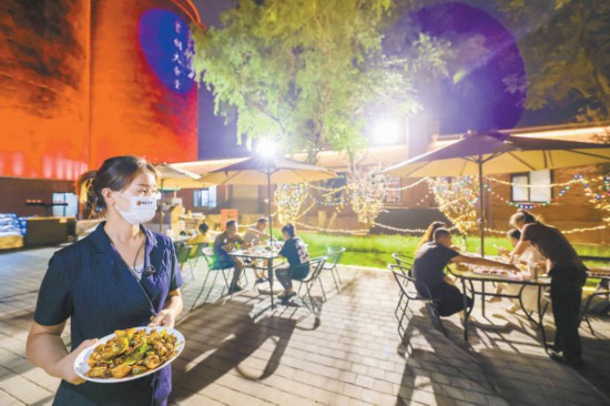 首鋼大食堂背后的巨大筒倉被紅色燈光照亮,游客在室外愜意就餐。本報(bào)記者 鄧偉攝