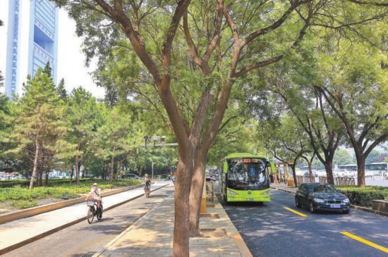 此外,在獨(dú)立的公交站臺(tái)外側(cè),利用原有綠地,新建非機(jī)動(dòng)車道和人行步道各一條,均為2.5米寬。自行車道采取外繞公交站臺(tái)方式,保障騎行路線安全、連續(xù)?!艾F(xiàn)在,從國(guó)貿(mào)橋到大望橋,自行車可以連續(xù)騎行,不再受公交車進(jìn)站影響。”殷浩介紹,該工程于今年4月進(jìn)場(chǎng)施工,目前已完工。