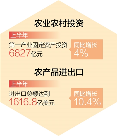 農(nóng)業(yè)農(nóng)村投資穩(wěn)步增長(zhǎng),農(nóng)村消費(fèi)市場(chǎng)逐步恢復(fù)。農(nóng)業(yè)農(nóng)村投資渠道拓寬。落細(xì)落實(shí)扎實(shí)穩(wěn)住經(jīng)濟(jì)一攬子政策措施,全力推動(dòng)重大政策落地實(shí)施和重大工程項(xiàng)目開工建設(shè)。上半年,第一產(chǎn)業(yè)固定資產(chǎn)投資6827億元,同比增長(zhǎng)4%。鄉(xiāng)村消費(fèi)持續(xù)恢復(fù)。鄉(xiāng)村消費(fèi)品零售額2.77萬億元,與去年基本持平,恢復(fù)到2019年的98%。農(nóng)產(chǎn)品進(jìn)出口保持增長(zhǎng)勢(shì)頭,進(jìn)出口總額達(dá)到1616.8億美元,同比增長(zhǎng)10.4%。