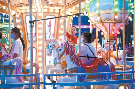 昨晚,北京經(jīng)開(kāi)區(qū)大族廣場(chǎng)室外區(qū)域熱鬧非常,市民趁著夜色來(lái)這里吃飯、購(gòu)物、游玩,廣場(chǎng)上的游樂(lè)設(shè)施前人頭攢動(dòng),孩子們?cè)诩议L(zhǎng)陪同下快樂(lè)玩耍。本報(bào)記者 和冠欣攝