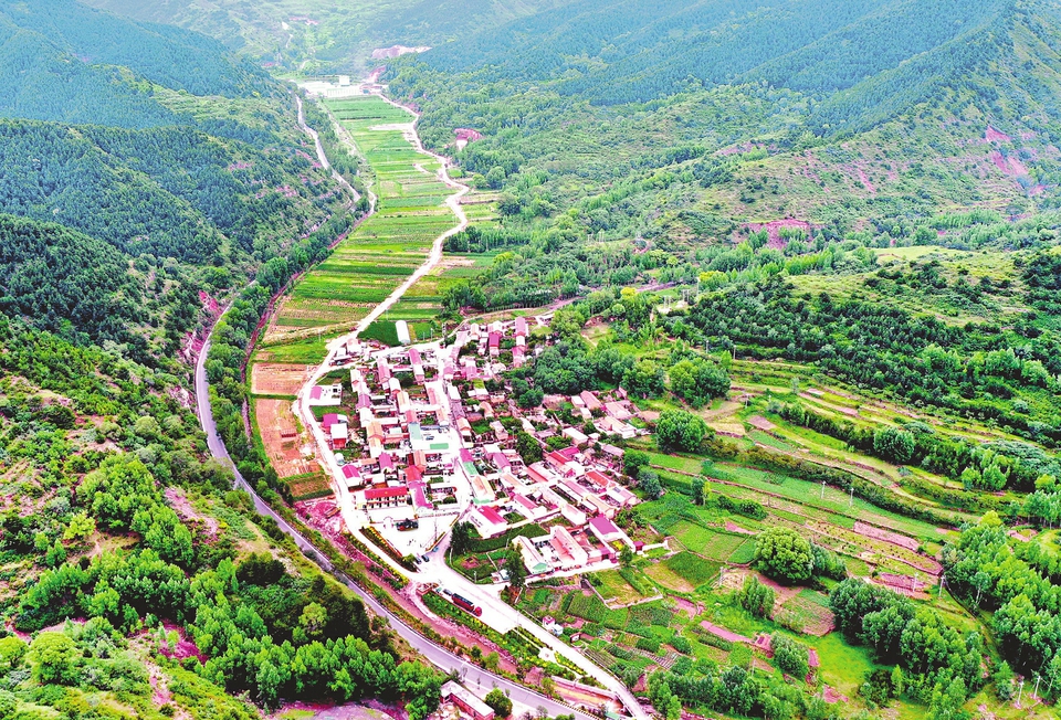 7月24日,俯瞰古交市邢家社鄉(xiāng)宋家莊村,道路蜿蜒,榛林蔥翠。近年來,該村依托當(dāng)?shù)刈匀画h(huán)境優(yōu)勢,以經(jīng)濟(jì)聯(lián)合社占股60%、農(nóng)民承包地入股占40%的方式經(jīng)營,實(shí)現(xiàn)大果榛子規(guī)?;⒓s化、產(chǎn)業(yè)化種植,舊日的撂荒地如今變成村民的聚寶盆。(記者劉通攝)