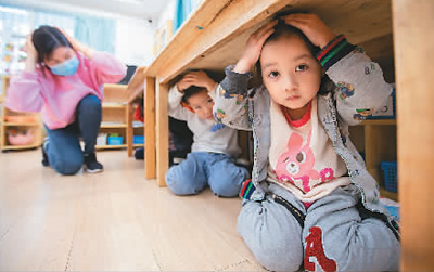 圖四:江蘇省南京市雨花臺(tái)區(qū)龍福幼兒園小朋友們學(xué)習(xí)防災(zāi)減災(zāi)自救技能。蘇陽攝(人民視覺)