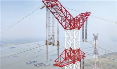 國網(wǎng)安徽電力施工人員在200多米的高空,進(jìn)行白鶴灘—江蘇工程的跨長江導(dǎo)線架設(shè)施工。張遠(yuǎn)溪攝(人民視覺)