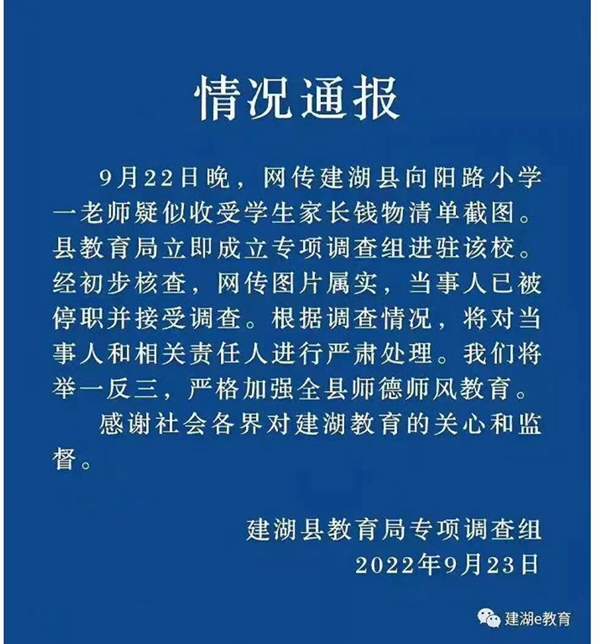 人民網(wǎng)南京9月23日電 (王丹丹)據(jù)“建湖e教育”微信公眾號消息,江蘇鹽城建湖縣教育局專項(xiàng)調(diào)查組發(fā)布情況通報(bào),9月22日晚,網(wǎng)傳建湖縣向陽路小學(xué)一老師疑似收受學(xué)生家長錢物清單截圖,縣教育局立即成立專項(xiàng)調(diào)查組進(jìn)駐該校。