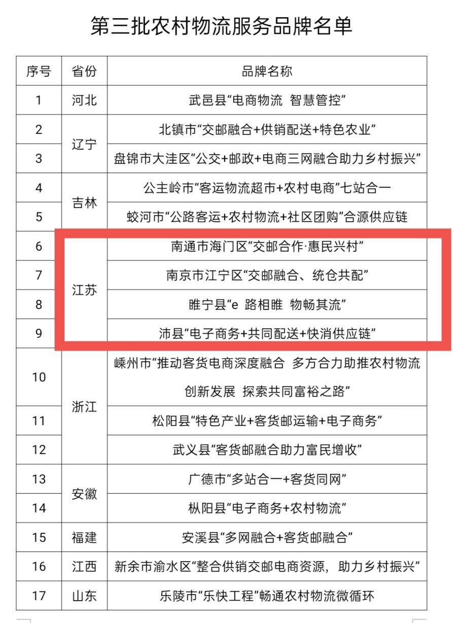 人民網(wǎng)南京10月13日電 近日,交通運(yùn)輸部辦公廳、國(guó)家郵政局辦公室聯(lián)合印發(fā)通知,發(fā)布全國(guó)第三批農(nóng)村物流服務(wù)品牌,共40個(gè)項(xiàng)目入選,覆蓋20個(gè)省份。江蘇南通市海門區(qū)“交郵合作·惠民興村”、南京市江寧區(qū)“交郵融合、統(tǒng)倉(cāng)共配”、睢寧縣“e 路相睢 物暢其流”、沛縣“電子商務(wù)+共同配送+快消供應(yīng)鏈”4個(gè)項(xiàng)目名列其中。至此,江蘇已累計(jì)有8個(gè)項(xiàng)目入選全國(guó)農(nóng)村物流服務(wù)品牌,數(shù)量居全國(guó)前列。
