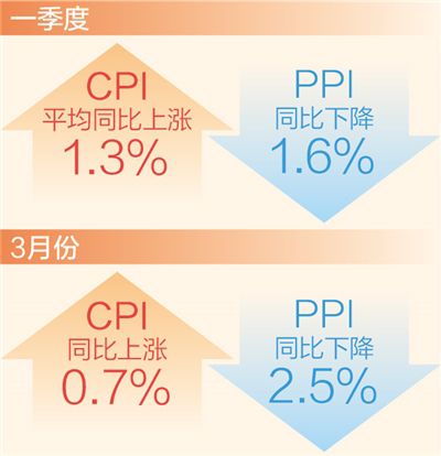 本報北京4月11日電 (記者劉志強)國家統計局11日發(fā)布數據顯示:3月份,CPI(居民消費價格指數)同比上漲0.7%,漲幅比上月回落0.3個百分點;PPI(工業(yè)生產者出廠價格指數)同比下降2.5%,降幅比上月擴大1.1個百分點。從一季度看,CPI平均同比上漲1.3%,PPI同比下降1.6%。一季度CPI持續(xù)運行在合理區(qū)間,物價保持平穩(wěn)運行,為全年物價穩(wěn)定奠定了堅實基礎。