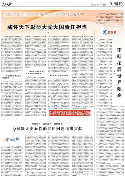 中國共產(chǎn)黨是為中國人民謀幸福、為中華民族謀復興的黨,也是為人類謀進步、為世界謀大同的黨。我們要拓展世界眼光,深刻洞察人類發(fā)展進步潮流,積極回應各國人民普遍關切,為解決人類面臨的共同問題作出貢獻,以海納百川的寬闊胸襟借鑒吸收人類一切優(yōu)秀文明成果,推動建設更加美好的世界。深刻認識和把握“六個必須堅持”系列理論版今天推出第六期,圍繞“必須堅持胸懷天下”進行闡述。