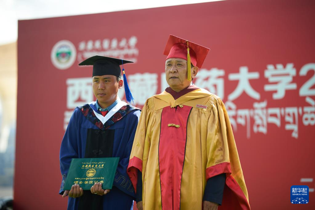 6月21日,西藏藏醫(yī)藥大學(xué)校長、博士生導(dǎo)師米瑪(右)與一名畢業(yè)生合影。新華社記者 旦增尼瑪曲珠 攝