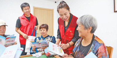 濱城區(qū)彭李街道學府社區(qū)志愿者在向居民講解防范養(yǎng)老詐騙知識。李 默 任增亮攝影報道