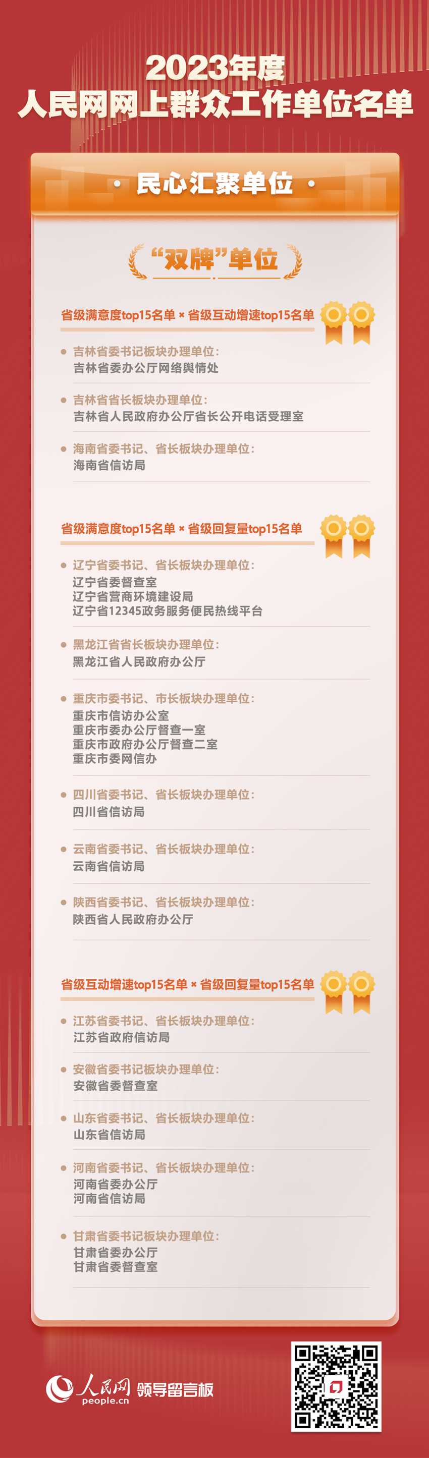 此次公布的名單綜合全國(guó)各地區(qū)各部門(mén)各單位近一年來(lái)的滿意度、互動(dòng)增速、回復(fù)量等指數(shù),著重突出各地區(qū)各部門(mén)各單位依托人民網(wǎng)“領(lǐng)導(dǎo)留言板”開(kāi)展網(wǎng)上群眾工作情況,選出2023年度人民網(wǎng)網(wǎng)上群眾工作“民心匯聚單位”“實(shí)干擔(dān)當(dāng)單位”“匯智為民單位”和“活力奮進(jìn)單位”。