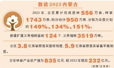 國土綠化成效顯著。全面打響“三北”工程攻堅戰(zhàn)和三大標(biāo)志性戰(zhàn)役,規(guī)劃的5個治理區(qū)域和11個重大工程全部納入國家“三北”工程規(guī)劃,全區(qū)103個旗縣(市、區(qū))全部納入“三北”工程實(shí)施范圍。2023年,全區(qū)累計完成造林556萬畝、種草1743萬畝、防沙治沙950萬畝,分別為年度計劃的149%、134%、151%,防沙治沙面積較2022年增加100萬畝以上。新建擴(kuò)建義務(wù)植樹基地124個,義務(wù)植樹3519萬株,參與綠化美化的鄉(xiāng)鎮(zhèn)蘇木370個、嘎查村700個。完成渾善達(dá)克規(guī)?;謭鼋ㄔO(shè)近28萬畝、累計達(dá)204萬畝,全區(qū)“綠色版圖”不斷擴(kuò)大。