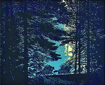 面對(duì)彼時(shí)套色木刻創(chuàng)作存在的這一問題,晁楣通過(guò)不懈研究與探索找到了解決的方法。他放棄了過(guò)去以黑線勾勒輪廓再以彩色填充的方式,大膽采用色塊拼接的新方法,將黑色與彩色并置在畫面中,使黑色輪廓線融入暗部,統(tǒng)一為一個(gè)個(gè)整體色塊。晁楣強(qiáng)調(diào),套色木刻中不能沒有黑色,因?yàn)樗诋嬅嬷邪l(fā)揮著重要的作用。這種“剪影式”的構(gòu)圖大量削減了輪廓線在畫面中的應(yīng)用,帶來(lái)強(qiáng)烈的色彩對(duì)比以及極具視覺張力的疏密關(guān)系,使得畫面結(jié)構(gòu)主次分明,保持了作品的整體感。試看晁楣的套色木刻作品《北陲屏障》,逆光的環(huán)境中,頂天立地、枝繁葉茂的松樹剪影占據(jù)了畫面的大部分空間,在遠(yuǎn)處光源的照耀下,一隊(duì)騎乘戰(zhàn)馬的巡邏兵疾馳而過(guò),形成了動(dòng)靜交織的畫面節(jié)奏。作品用為數(shù)不多的色彩營(yíng)造光感,套色簡(jiǎn)潔自然,茂密枝干交織形成的無(wú)數(shù)小色塊,展現(xiàn)出藝術(shù)家精湛的運(yùn)刀技藝。