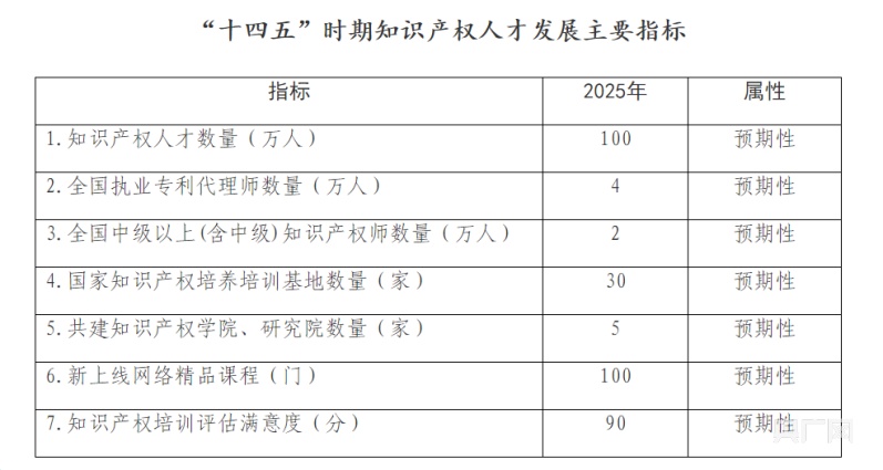 《規(guī)劃》提出,到2025年,知識(shí)產(chǎn)權(quán)人才數(shù)量超過100萬人,全國(guó)執(zhí)業(yè)專利代理師數(shù)量達(dá)4萬人,全國(guó)中級(jí)以上(含中級(jí))知識(shí)產(chǎn)權(quán)師數(shù)量達(dá)2萬人?!兑?guī)劃》還提出要做好知識(shí)產(chǎn)權(quán)保護(hù)人才、知識(shí)產(chǎn)權(quán)高效運(yùn)用人才、知識(shí)產(chǎn)權(quán)公共服務(wù)人才、知識(shí)產(chǎn)權(quán)國(guó)際化人才四支重點(diǎn)人才隊(duì)伍和知識(shí)產(chǎn)權(quán)審查、宣傳等各級(jí)各類基礎(chǔ)人才隊(duì)伍建設(shè)。