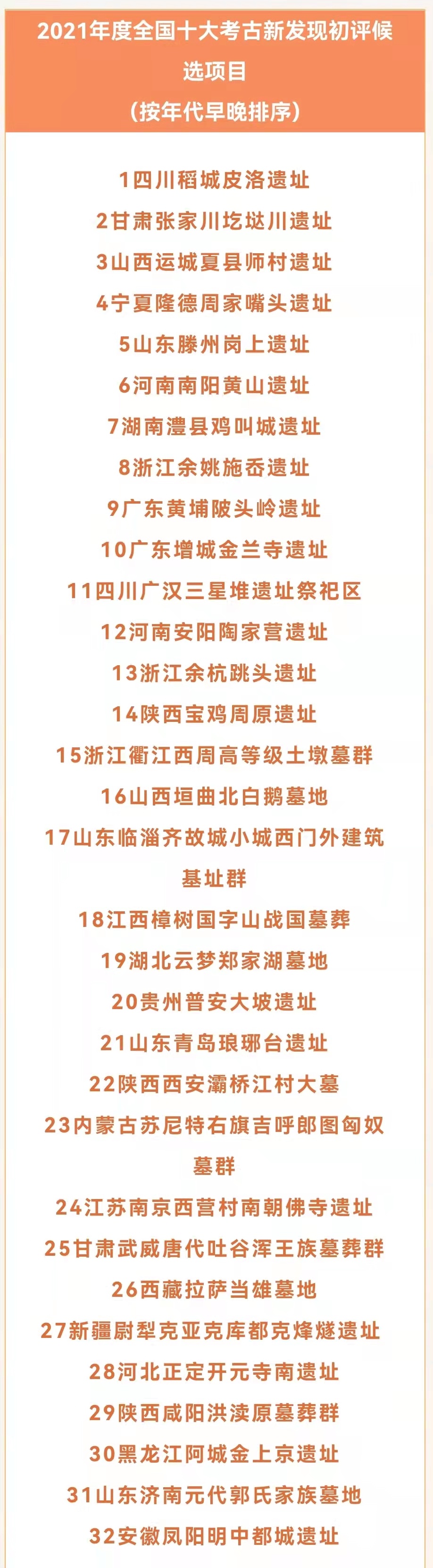 2021年,全國經(jīng)過審批的考古發(fā)掘1700余項(xiàng)。候選項(xiàng)目均為各發(fā)掘資質(zhì)單位主動申報,經(jīng)國家文物局審核,最終確定32項(xiàng)參評(名單如下)。評選活動辦公室將組織投票推薦產(chǎn)生20項(xiàng)進(jìn)入終評。
