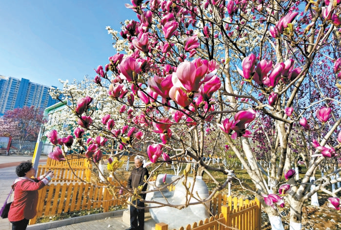 5日,許多市民來到北京國際雕塑公園踏青賞花,在盛開的玉蘭花前拍照留念。本報(bào)記者 吳鏑攝