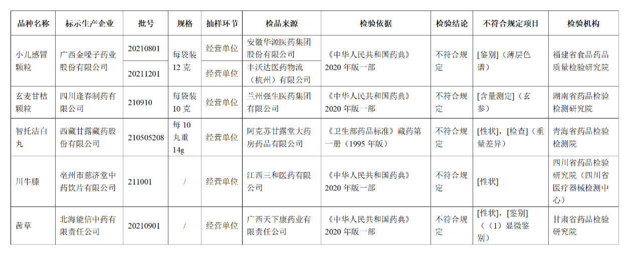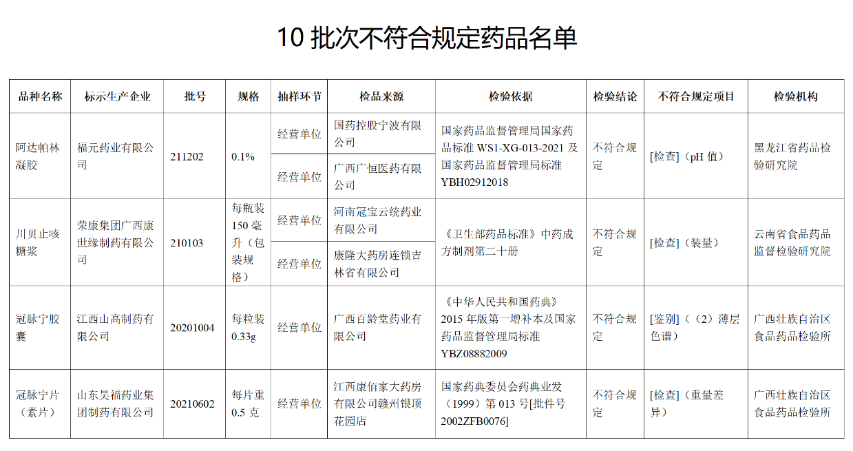 這些藥品包括:標(biāo)示為廣西金嗓子藥業(yè)股份有限公司生產(chǎn)的2批次小兒感冒顆粒不符合規(guī)定,不符合規(guī)定項目為鑒別;標(biāo)示為福元藥業(yè)有限公司生產(chǎn)的1批次阿達(dá)帕林凝膠不符合規(guī)定,不符合規(guī)定項目為pH值;標(biāo)示為榮康集團廣西康世緣制藥有限公司生產(chǎn)的1批次川貝止咳糖漿不符合規(guī)定,不符合規(guī)定項目為裝量等。