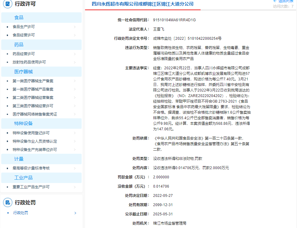 處罰決定文書顯示,經(jīng)查,2022年2月22日,當(dāng)事人四川永輝超市有限公司成都錦江區(qū)錦江大道分公司從成都凱博農(nóng)業(yè)發(fā)展有限公司購進(jìn)57公斤食用農(nóng)產(chǎn)品砂糖桔,購進(jìn)價(jià)格為每公斤7.40元。當(dāng)事人銷售的砂糖桔經(jīng)抽樣檢驗(yàn),苯醚甲環(huán)唑項(xiàng)目不符合GB 2763-2021《食品安全國(guó)家標(biāo)準(zhǔn) 食品中農(nóng)藥最大殘留限量》要求,檢驗(yàn)結(jié)論為不合格。據(jù)調(diào)查,該抽檢不合格批次砂糖桔除1.6公斤售賣抽樣單位外,剩余55.4公斤已全部售賣消費(fèi)者,銷售價(jià)格為每公斤9.98元。經(jīng)計(jì)算,本案貨值金額為568.86元,違法所得為147.06元。