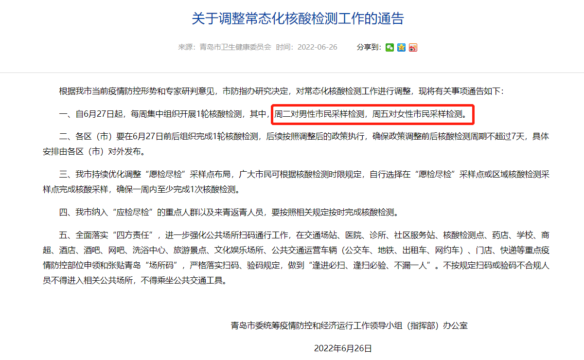 同時,青島市衛(wèi)健委強調,“男女分開檢測”是基本原則,不是截然分開。若有特殊情況,各采樣點同樣會提供服務。另“男女分開檢測”主要用于社區(qū)集中組織,其他時間和需求,市民可以通過常態(tài)化開放的“愿檢盡檢”采樣點完成采樣,因此新政策不會給市民帶來不便。無論您在哪里采樣,一定要記得一周至少檢測一次。