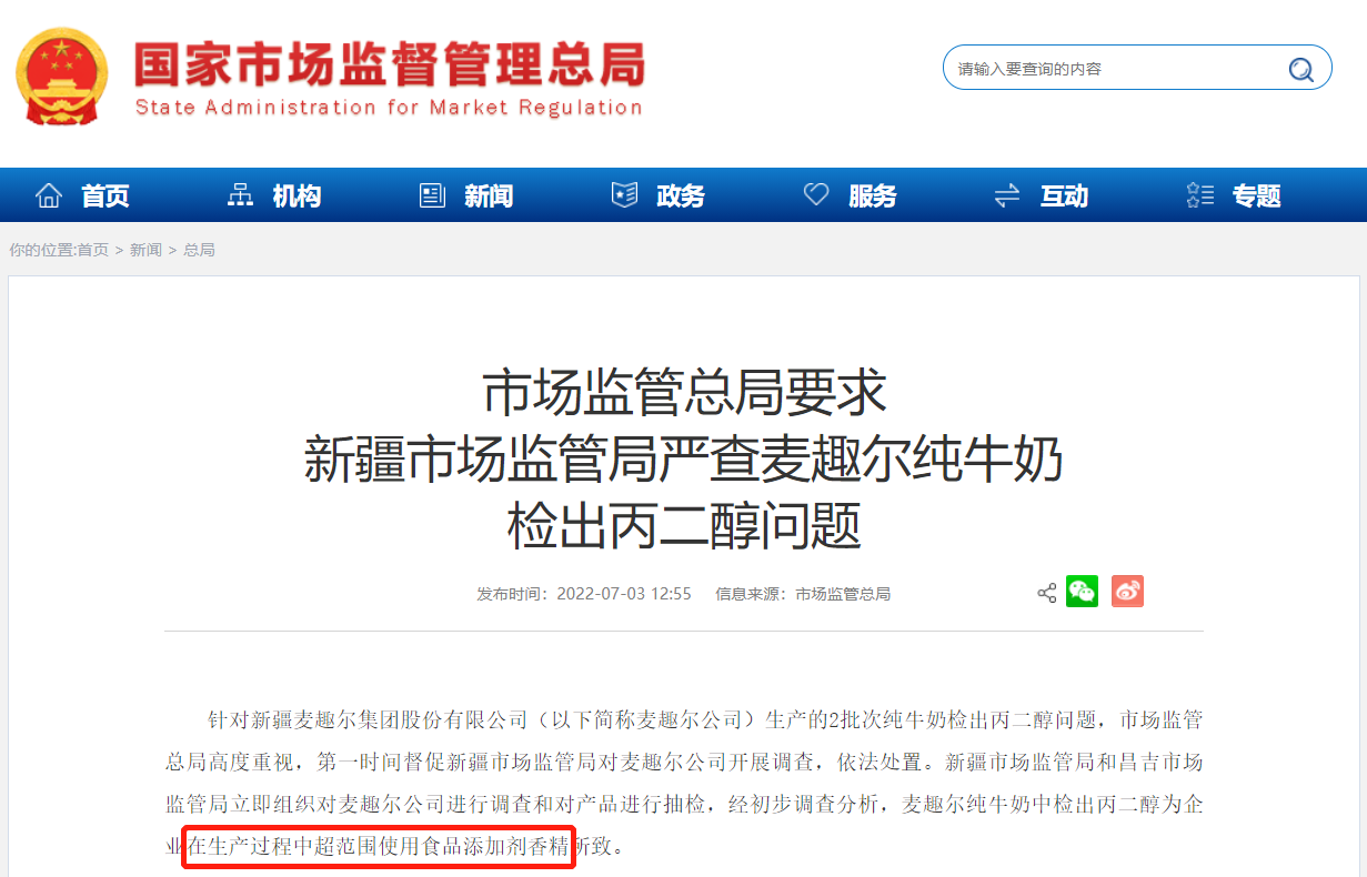7月3日,國家市場監(jiān)管總局發(fā)布消息,要求“嚴(yán)查麥趣爾純牛奶檢出丙二醇問題”,并表示“經(jīng)初步調(diào)查分析,麥趣爾純牛奶中檢出丙二醇為企業(yè)在生產(chǎn)過程中超范圍使用食品添加劑香精所致?!?/p>