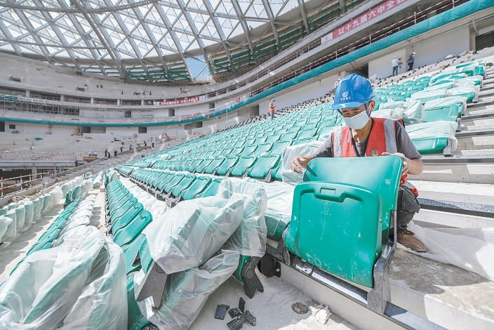 在新工體壯觀的鋼罩棚之下,一張張嶄新的“國(guó)槐綠”座椅被安裝到位。本報(bào)記者 潘之望攝