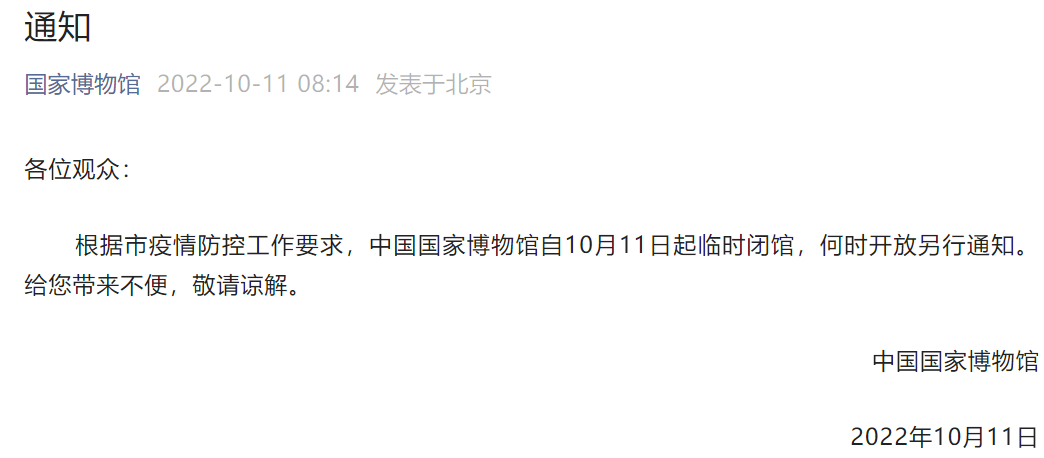 央廣網(wǎng)北京10月11日消息 據(jù)國(guó)家博物館官方微信公眾號(hào)消息,根據(jù)北京市疫情防控工作要求,中國(guó)國(guó)家博物館自10月11日起臨時(shí)閉館,何時(shí)開(kāi)放另行通知。