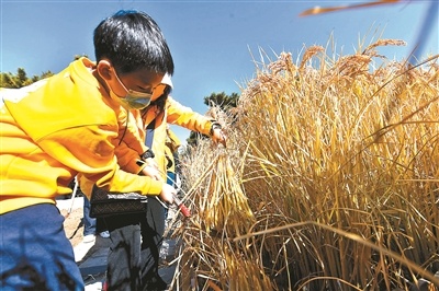 昨天上午,北京青年報記者來到先農(nóng)壇,觀耕臺前的一畝三分地上,水稻已經(jīng)成熟,稻穗在陽光下隨風(fēng)搖曳,煥發(fā)出金燦燦的光澤,構(gòu)成獨特的古都秋景。隨著主持人開鑼、小朋友們齊喊“豐收嘍”,收割儀式正式開始。在場嘉賓和10名小朋友一起收割第一鐮新稻子,寓意豐收碩果新開始。