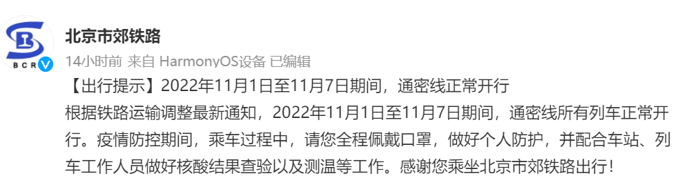 央廣網(wǎng)北京11月1日消息 據(jù)北京市郊鐵路官方微博消息,根據(jù)鐵路運(yùn)輸調(diào)整最新通知,2022年11月1日至11月7日期間,通密線所有列車正常開(kāi)行。