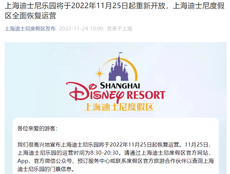 11月25日起,上海迪士尼樂園恢復(fù)運(yùn)營(yíng)