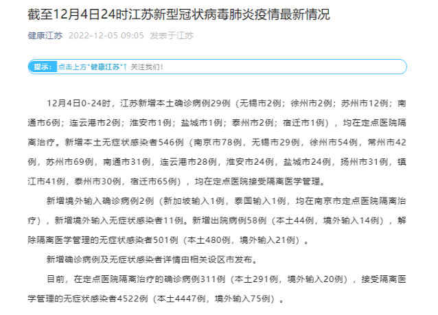 央廣網(wǎng)南京12月5日消息(記者王錫斐)據(jù)“健康江蘇”微信公眾號消息,12月4日0-24時,江蘇新增本土確診病例29例(無錫市2例;徐州市2例;蘇州市12例;南通市6例;連云港市2例;淮安市1例;鹽城市1例;泰州市2例;宿遷市1例),均在定點醫(yī)院隔離治療。新增本土無癥狀感染者546例(南京市78例,無錫市29例,徐州市54例,常州市42例,蘇州市69例,南通市31例,連云港市28例,淮安市24例,鹽城市24例,揚州市31例,鎮(zhèn)江市41例,泰州市30例,宿遷市65例),均在定點醫(yī)院接受隔離醫(yī)學(xué)管理。