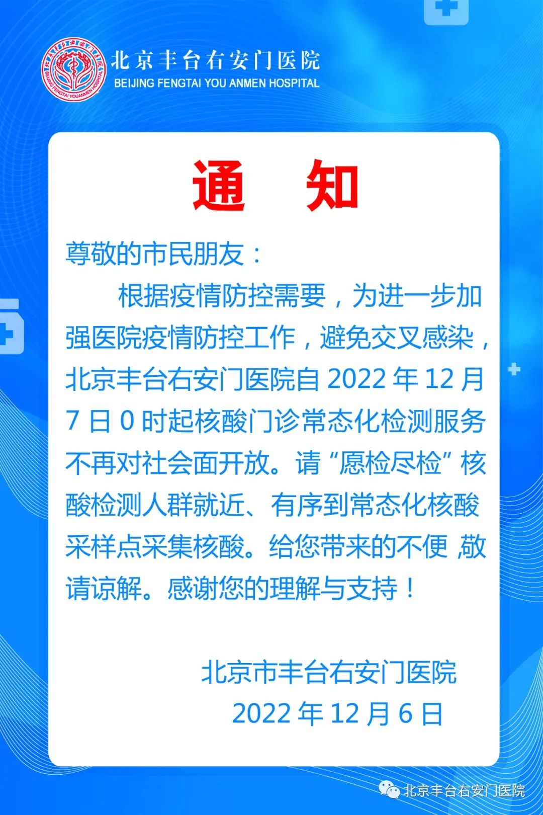 12月6日,北京豐臺右安門醫(yī)院發(fā)布核酸門診停診通知。其中提到,12月7日起核酸門診常態(tài)化檢測服務不再對社會面開放。