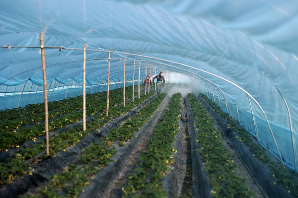 農(nóng)民在大棚內(nèi)給草莓噴施營養(yǎng)液(央廣網(wǎng)發(fā) 顧繼紅 攝)