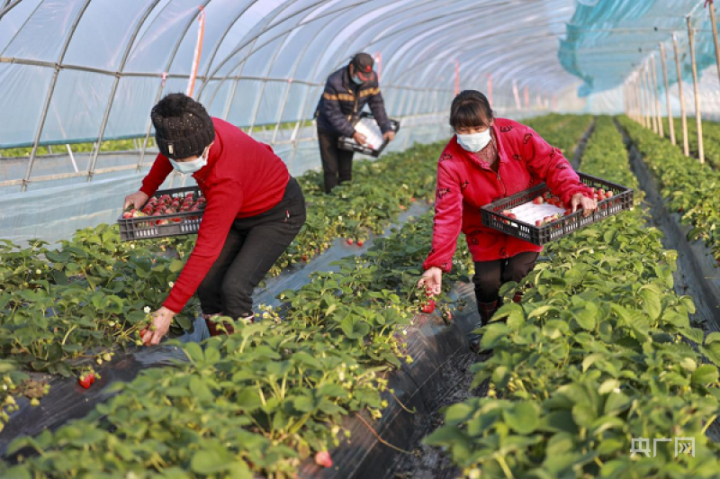 農(nóng)民們在大棚內(nèi)采摘草莓(央廣網(wǎng)記者 王姝姝 攝)