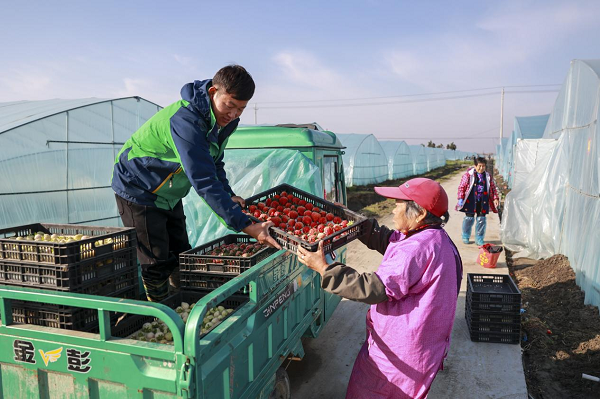 農(nóng)民在將剛采摘的紅草莓裝車(央廣網(wǎng)發(fā) 王安卿 攝)