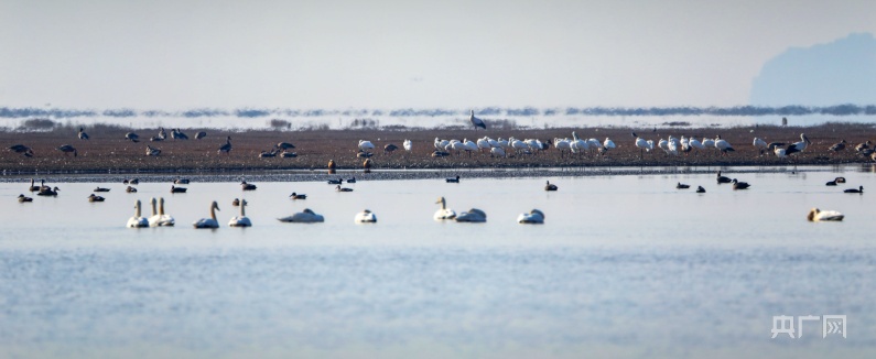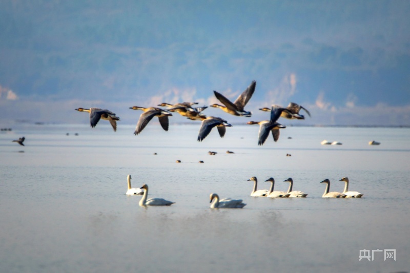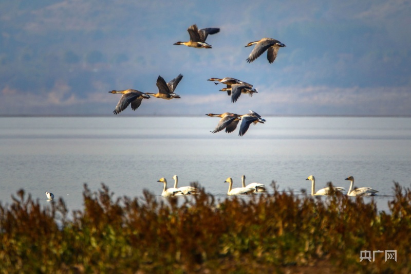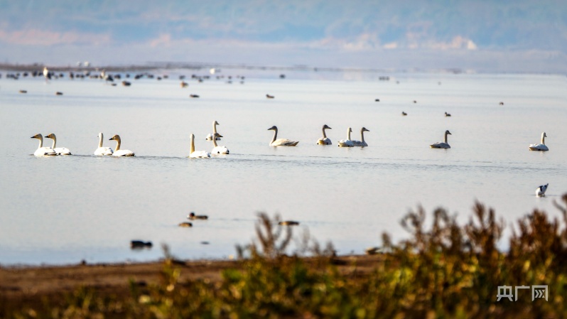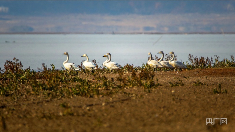 冬日暖陽下,它們或在岸邊草叢覓食,或在水面交頸相依,時而引吭高歌,似為迎接新年的到來。