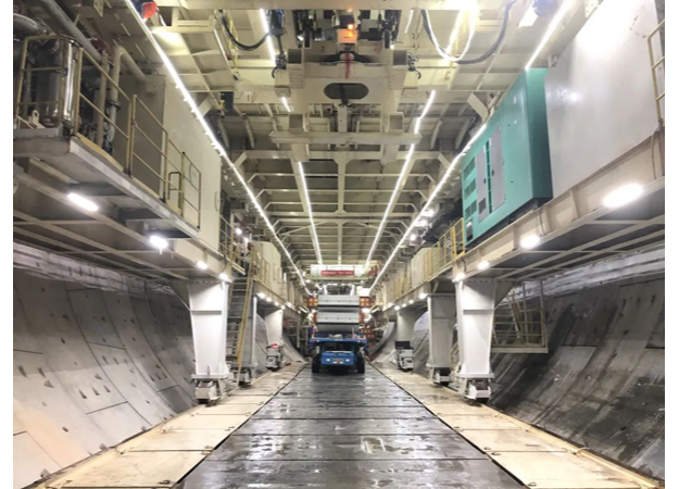 珠海興業(yè)快線(xiàn)隧道工程現(xiàn)場(chǎng),一臺(tái)重4500噸、超5層樓高的“地下航母”正奮勇掘進(jìn),管片一片一片拼裝,隧道隨之一米一米建成。這臺(tái)“地下航母”,就是由中交天和自主研制的中國(guó)首臺(tái)超大直徑同步掘進(jìn)機(jī)“興業(yè)號(hào)”,這也是國(guó)內(nèi)首次采用的同步掘進(jìn)設(shè)計(jì)。常規(guī)隧道掘進(jìn)機(jī)拼裝管片,一環(huán)管片寬2米,刀頭油缸推動(dòng),而油缸推動(dòng)距離僅為2米多。因而,掘進(jìn)2米后必須停止,掘進(jìn)一環(huán)耗時(shí)近60分鐘,拼裝管片一環(huán)耗時(shí)近45分鐘。“興業(yè)號(hào)”的關(guān)鍵在于同步掘進(jìn),它改變了傳統(tǒng)油缸設(shè)計(jì),推動(dòng)距離可延長(zhǎng)至4米,刀頭可實(shí)現(xiàn)持續(xù)掘進(jìn),后方同時(shí)拼裝管片,施工速度較國(guó)內(nèi)外同類(lèi)掘進(jìn)機(jī)提升25-35%,對(duì)超大直徑盾構(gòu)機(jī)發(fā)展具有一定劃時(shí)代意義。