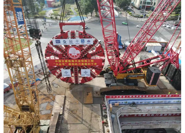 珠海興業(yè)快線(xiàn)隧道工程是未來(lái)連通港珠澳大橋和深中通道,把珠海市打造成為“粵港澳交通樞紐”的重要工程。盾構(gòu)隧道長(zhǎng)度僅1740米,但地質(zhì)情況極為復(fù)雜,其中:硬巖段占比超過(guò)70%,被稱(chēng)“地質(zhì)博物館”,且為首個(gè)國(guó)內(nèi)直徑最大雙層疊落盾構(gòu)工程,雙層疊落長(zhǎng)約604米,盾構(gòu)法施工面臨不少世界級(jí)難題。為順利完成這項(xiàng)重大工程,中交天和立足自主研發(fā),著眼科技創(chuàng)新,為適應(yīng)在硬巖地質(zhì)中提高掘進(jìn)速度,實(shí)現(xiàn)隧道掘進(jìn)和管片拼裝同步施工,成功研制中國(guó)首臺(tái)超大直徑同步掘進(jìn)機(jī)“興業(yè)號(hào)”。該掘進(jìn)機(jī)國(guó)產(chǎn)化率達(dá)98%以上、刀盤(pán)直徑15.76米,全長(zhǎng)超130米,攻克了許多難以想象的世界級(jí)難題。