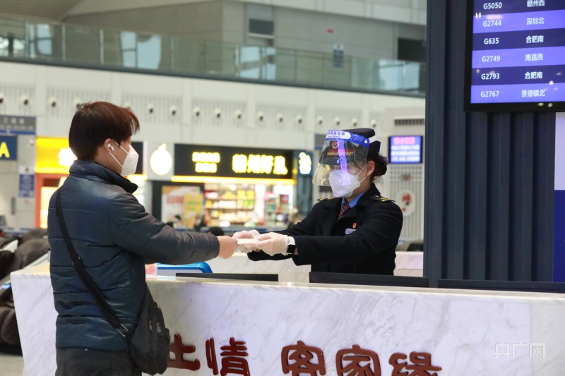 贛州西站服務臺為旅客提供口罩(央廣網(wǎng)發(fā) 鄒陽 攝)